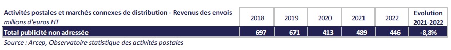 L’Autorité de régulation des communications électroniques, des postes et de la distribution de la presse publie les résultats de l’enquête annuelle 2022 menée sur les marchés des activités postales et des activités connexes. Cette enquête est conduite auprès des opérateurs autorisés au 31 décembre 2022 et des opérateurs des marchés non soumis à autorisation pour la publicité non adressée.