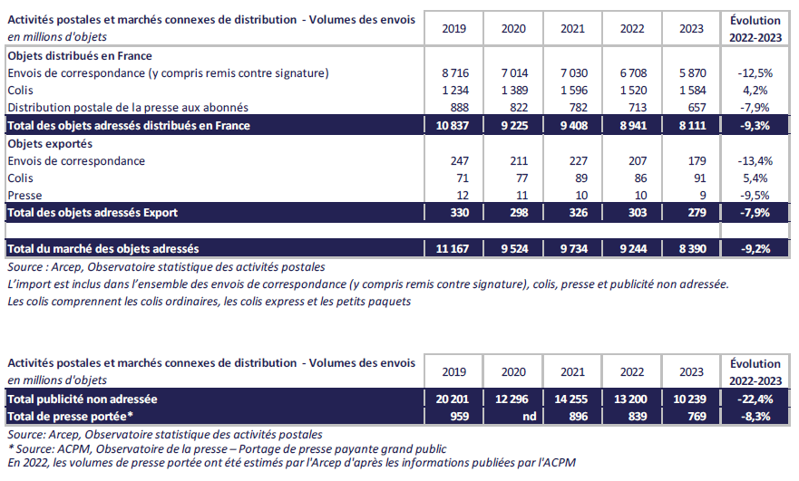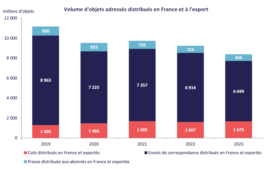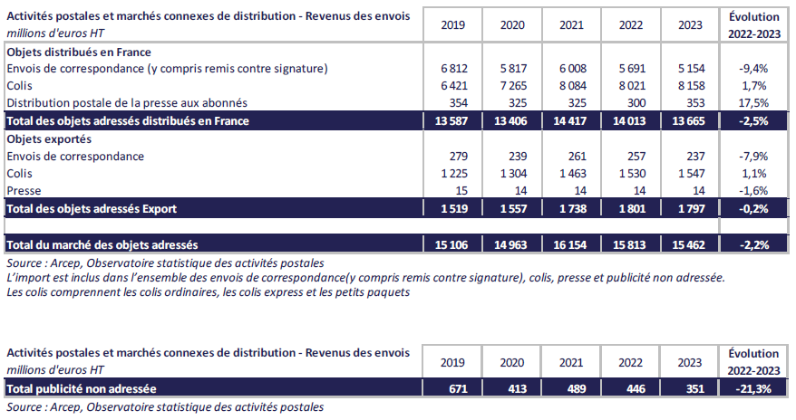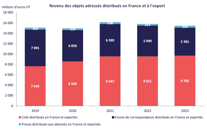 En 2023, 8,4 milliards d’objets adressés (plis, colis, presse par circuit postal) ont été distribués en France ou exportés, pour un revenu s’élevant à 15,5 milliards d’euros hors taxes. En repli d’environ 9 % par rapport à 2022, le volume d’objets adressés diminue à un rythme sensiblement supérieur à l’année précédente. Cette baisse s’inscrit dans la continuité de la réduction structurelle des flux postaux engagée depuis plus de quinze ans. Le revenu généré par l’envoi et la distribution des objets adressés, qui suivait une tendance haussière jusqu’en 2021 porté par le marché du colis, diminue pour la deuxième année consécutive, enregistrant une baisse de 2,2 %.
