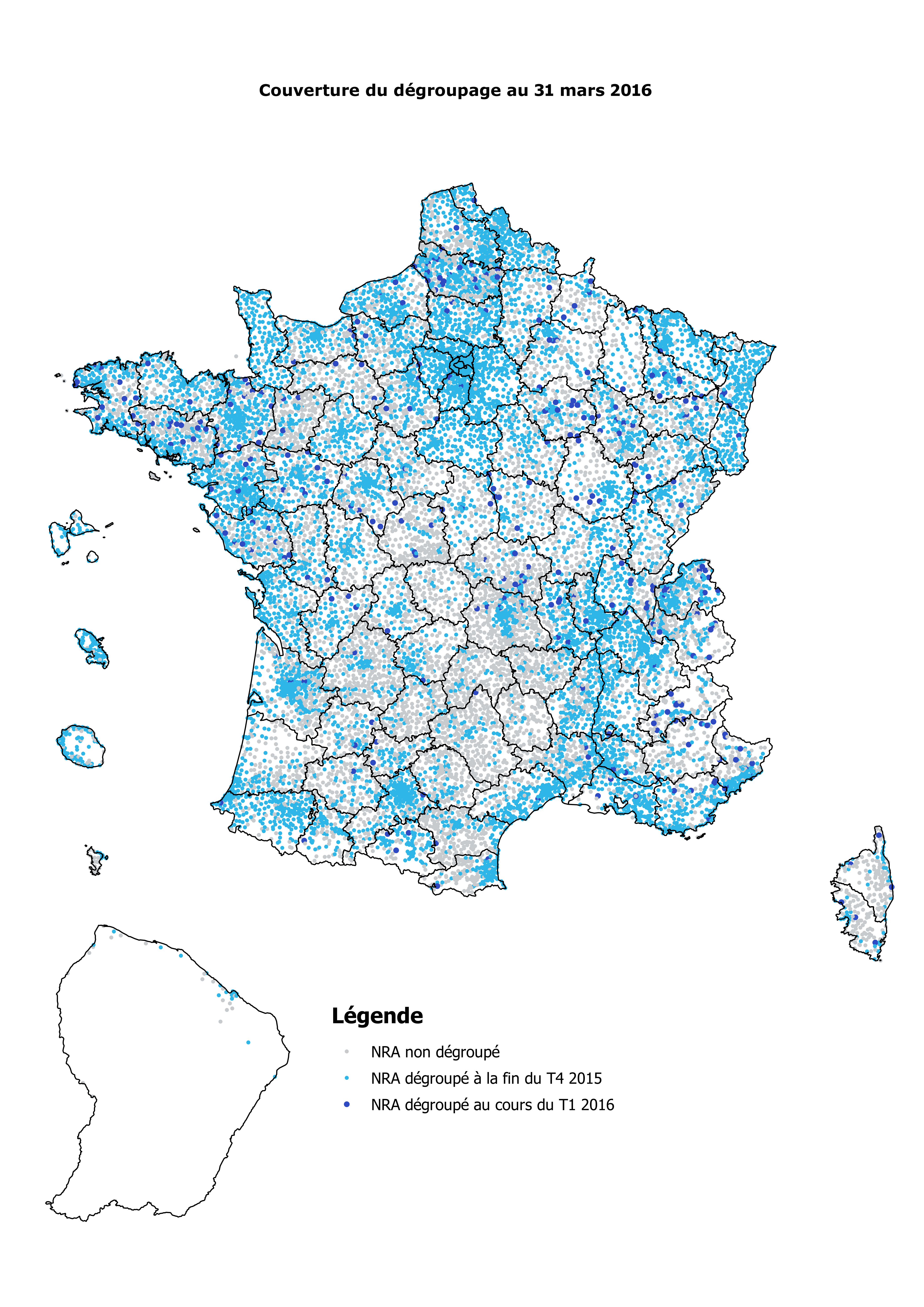 Avec 9 976 NRA dégroupés (c'est-à-dire ceux où au moins un opérateur alternatif a installé ses équipements actifs au sein du NRA) - dont 422 NRA-ZO et 1028 NRA-MeD - au 31 mars 2016 (soit 450 NRA dégroupés au cours du trimestre passé), 92,2 % de la population peut bénéficier de la diversification et de l'enrichissement des offres résultant du dégroupage.