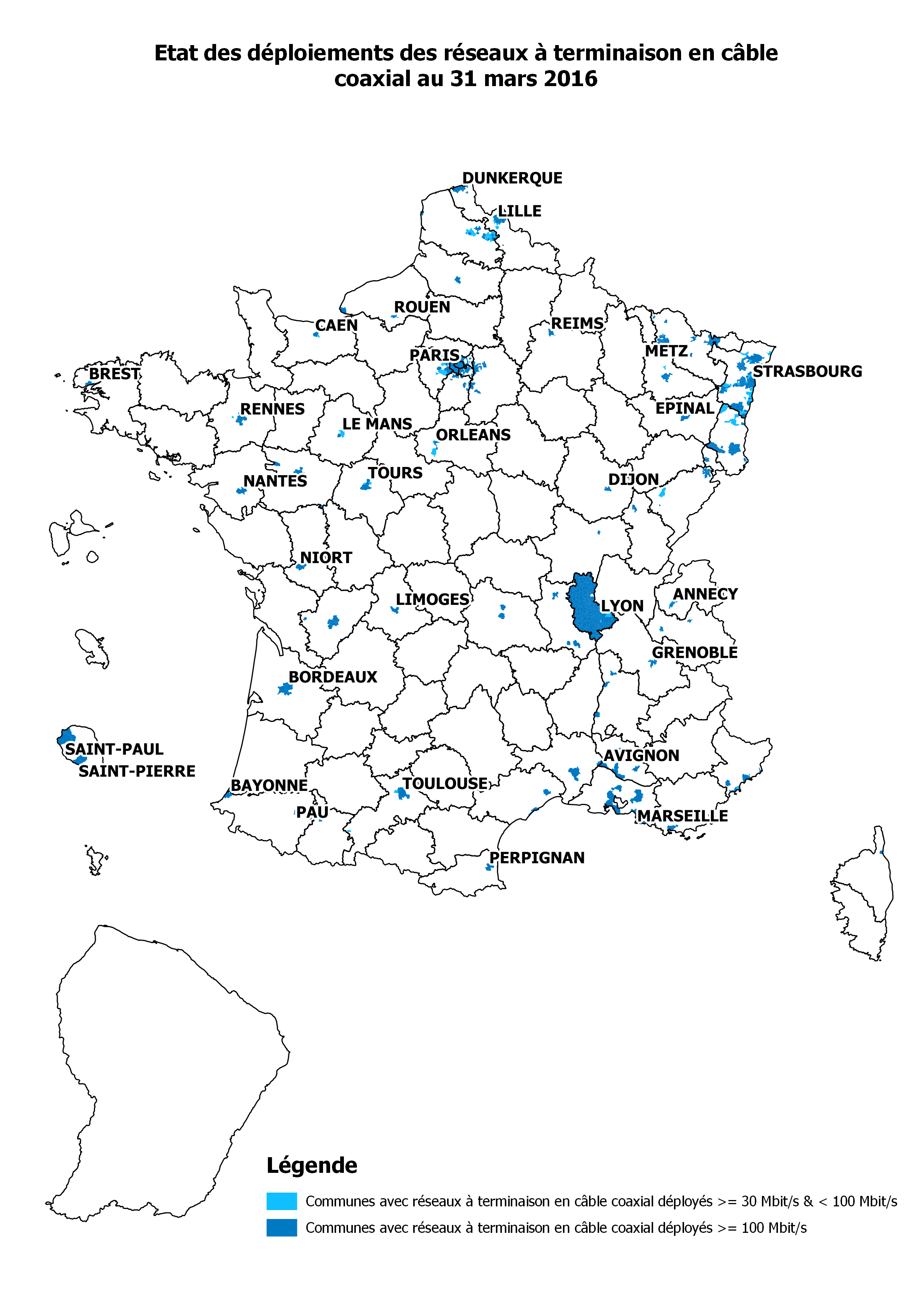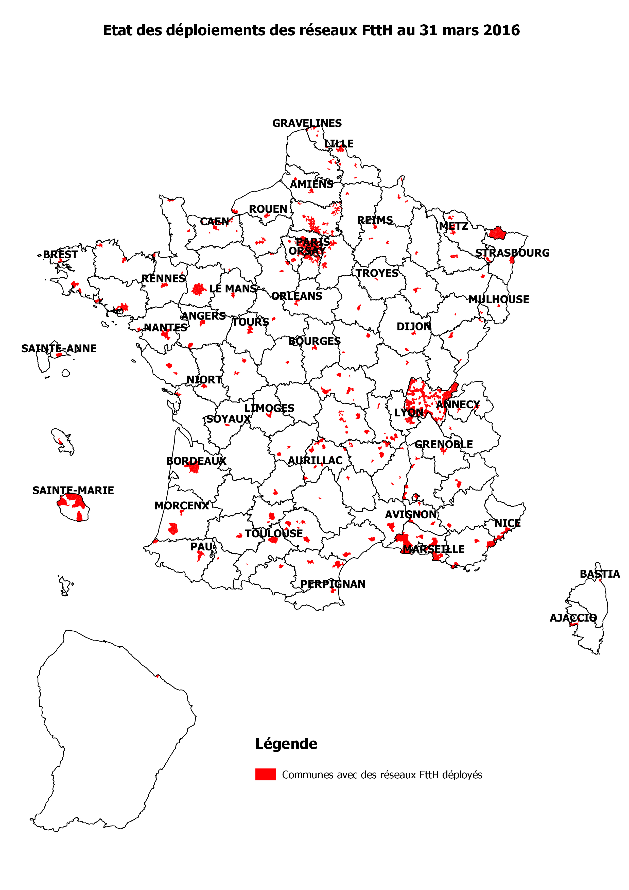 Le nombre total de logements éligibles aux offres à très haut débit (supérieur ou égal à 30 Mbit/s) toutes technologies confondues, s'élevait au 31 mars 2016 à environ 14,8 millions de logements, dont 9,3 millions se situent en dehors des zones très denses. Il est important de signaler que certains de ces logements peuvent bénéficier de plusieurs accès au très haut débit : réseau à terminaison en câble coaxial, réseau en fibre optique de bout en bout (FttH) ou réseau de cuivre (VDSL2).