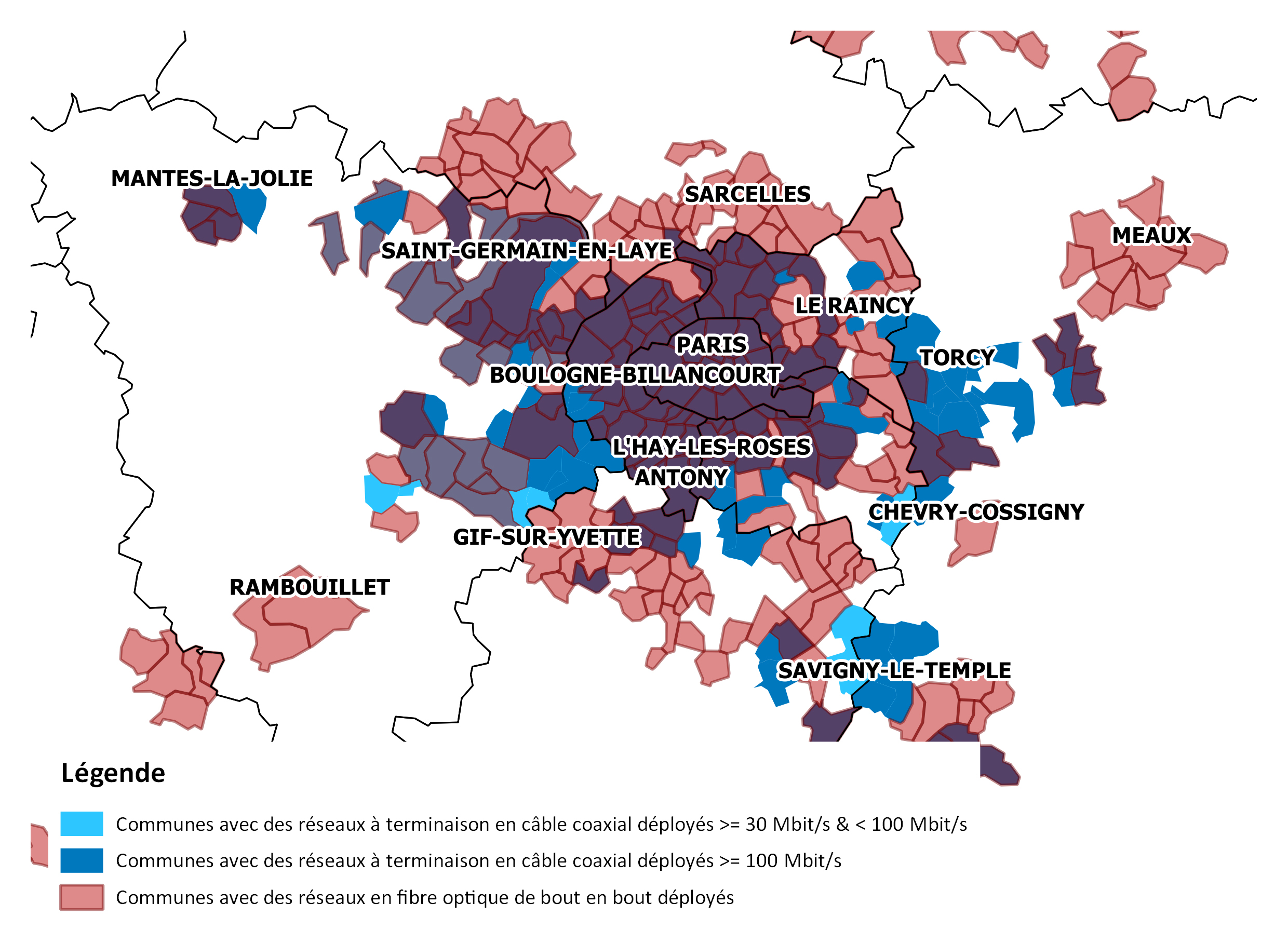 Les cartes ci-dessous illustrent l'état des déploiements en cours de réseaux en fibre optique de bout en bout et de réseaux à terminaison en câble coaxial au niveau national, avec des informations plus détaillées sur l'Ile-de-France.