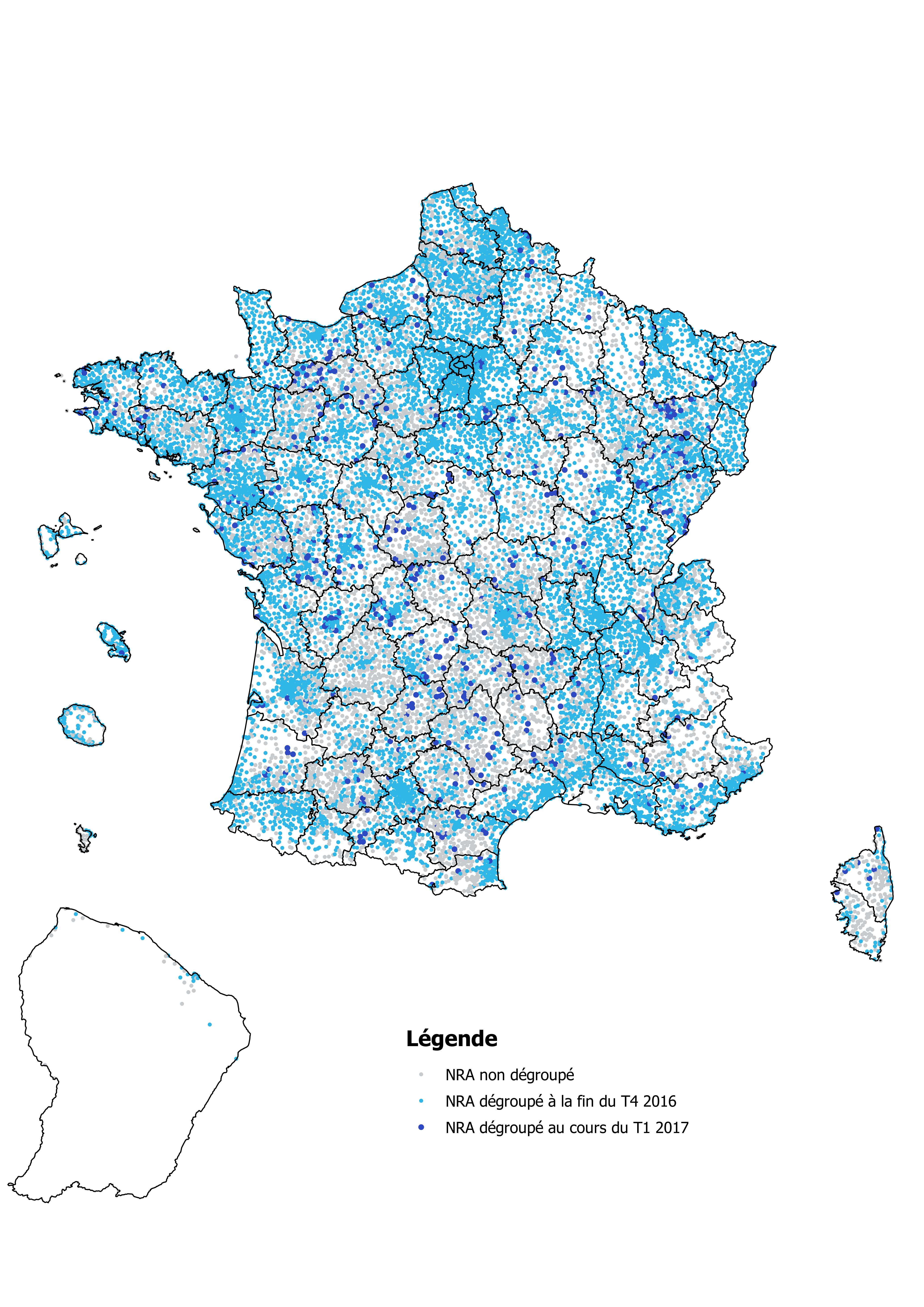 La totalité des 18 853 NRA (Nœuds de raccordement d'abonnés, sièges des répartiteurs) sont aujourd'hui équipés en DSL en métropole et dans les DOM, et 99,7 % des lignes en cuivre sont éligibles à un service haut débit. Ce calcul repose sur l'affaiblissement théorique des lignes et prend également en compte les lignes inéligibles au haut débit du fait des équipements de multiplexage.