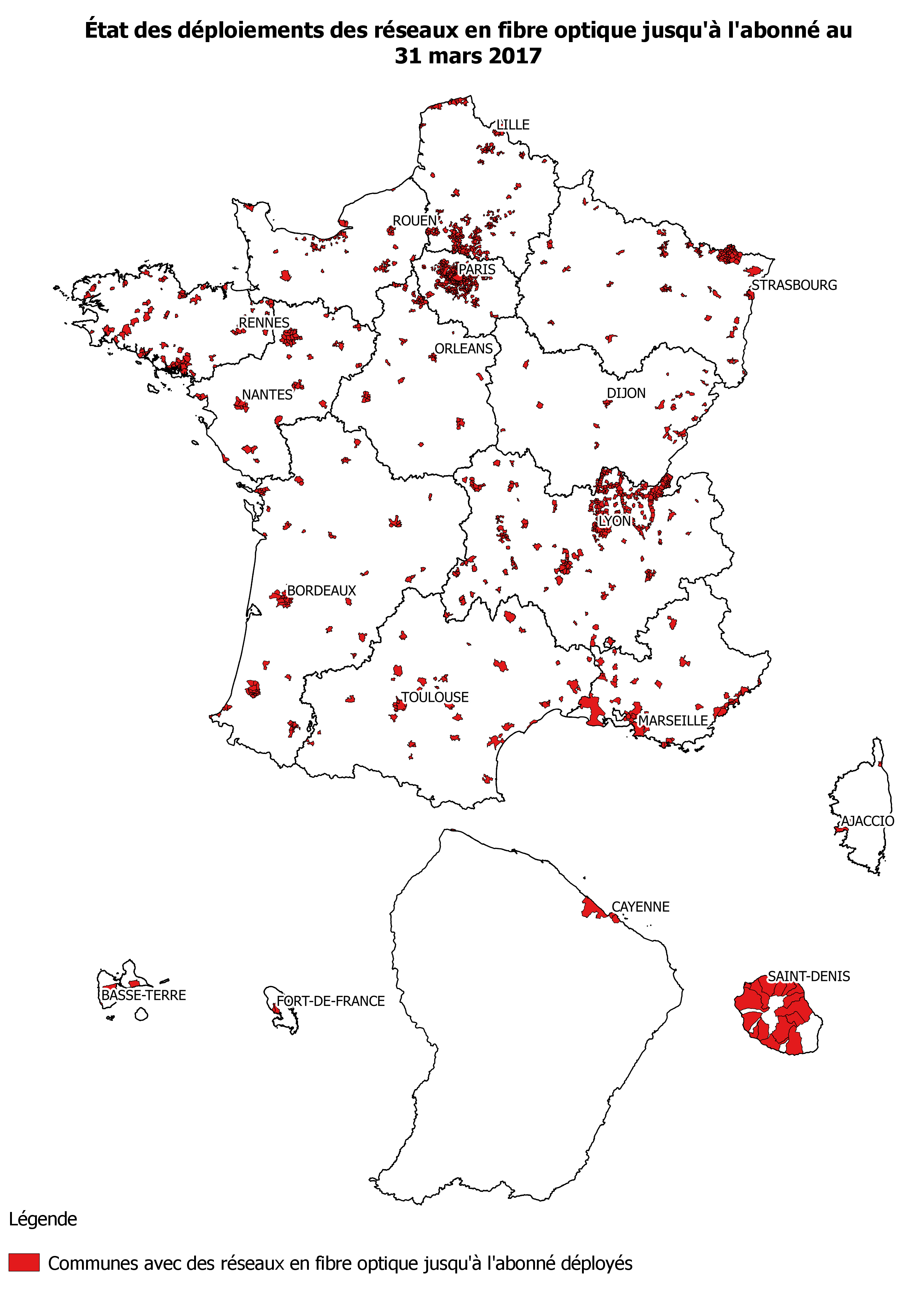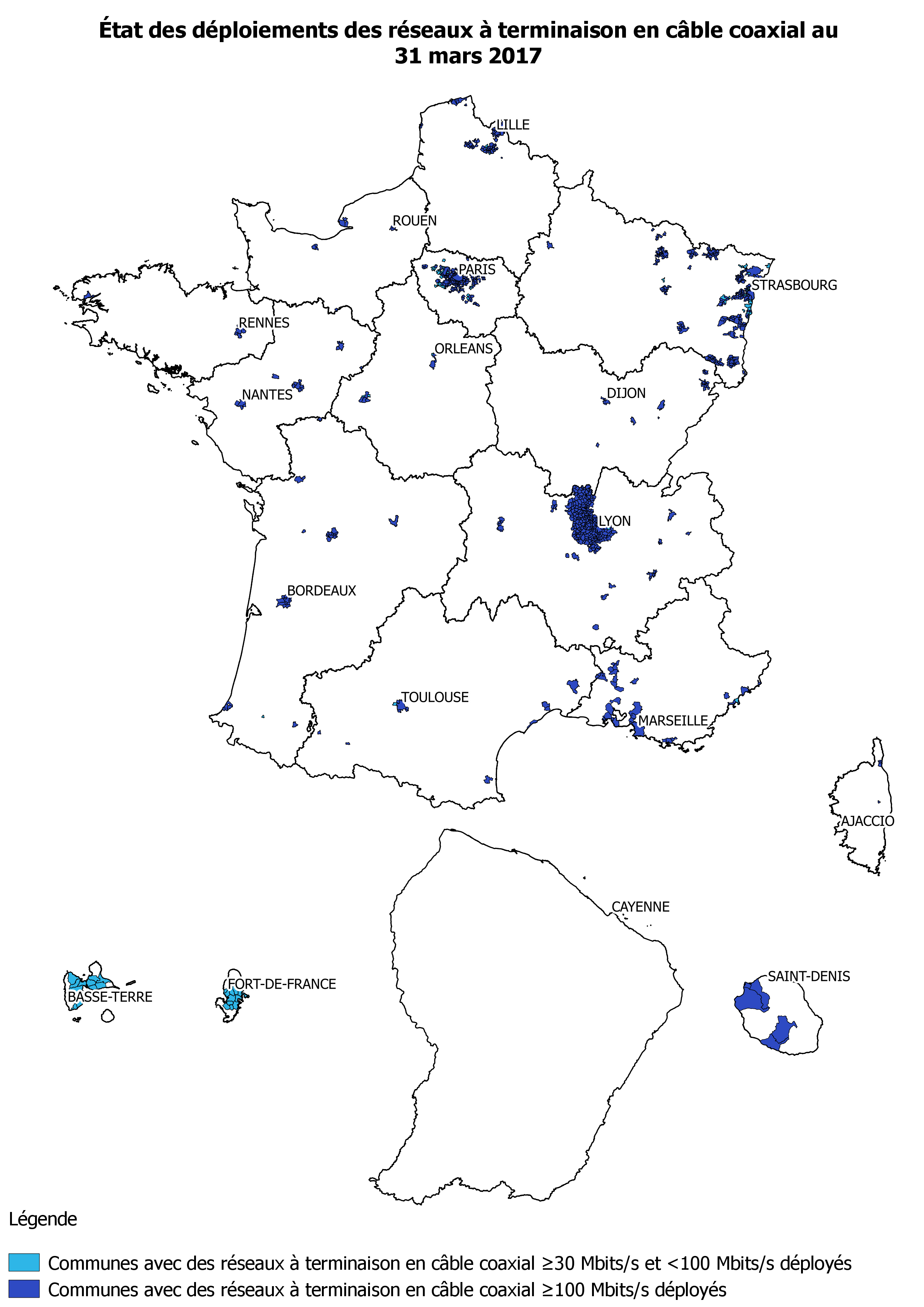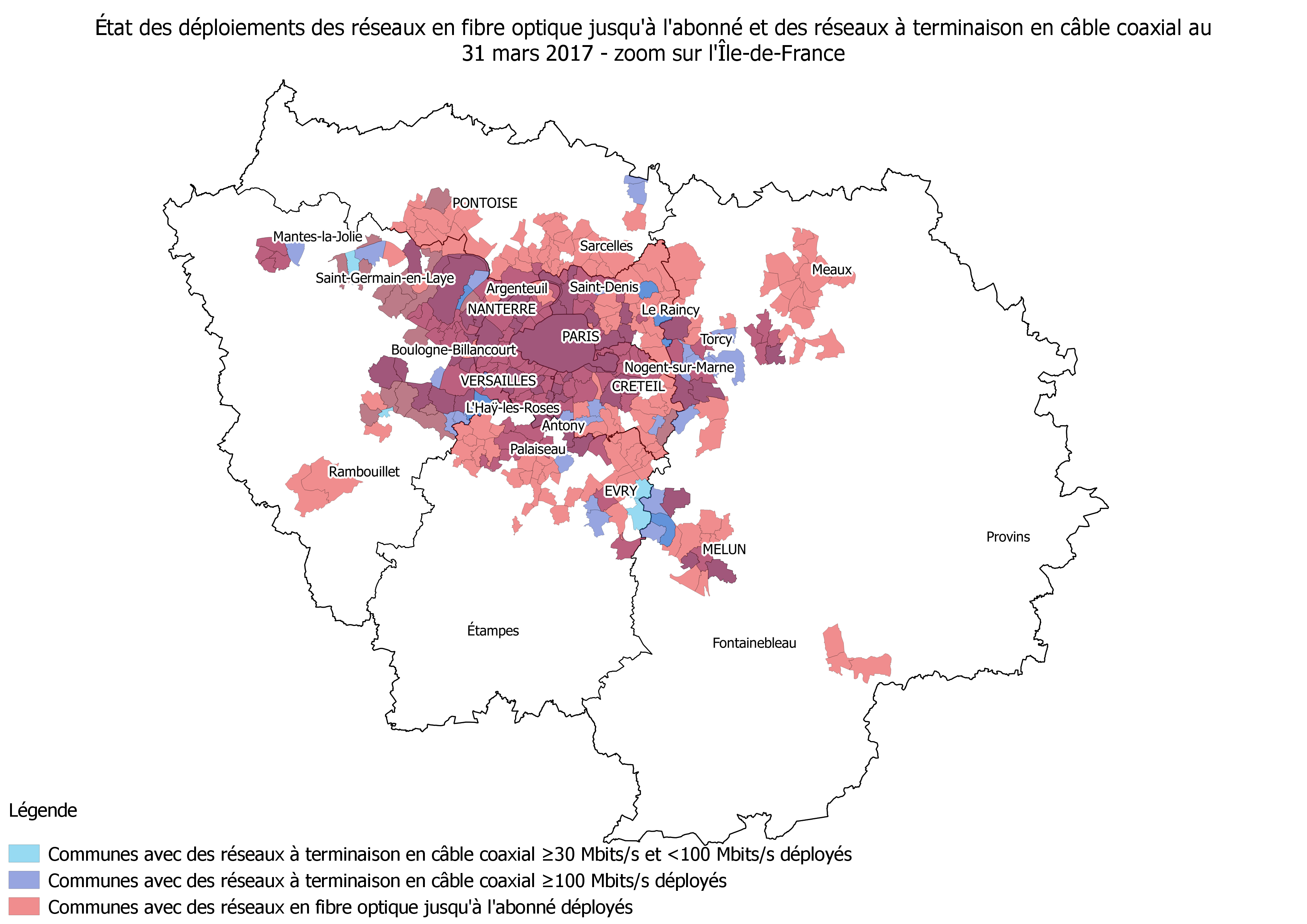 Les cartes ci-dessous illustrent l'état des déploiements des réseaux en fibre optique de jusqu'à l'abonné et des réseaux à terminaison à terminanison en câble coaxial au niveau national, avec des informations plus détaillées sur l'Île-de-France.