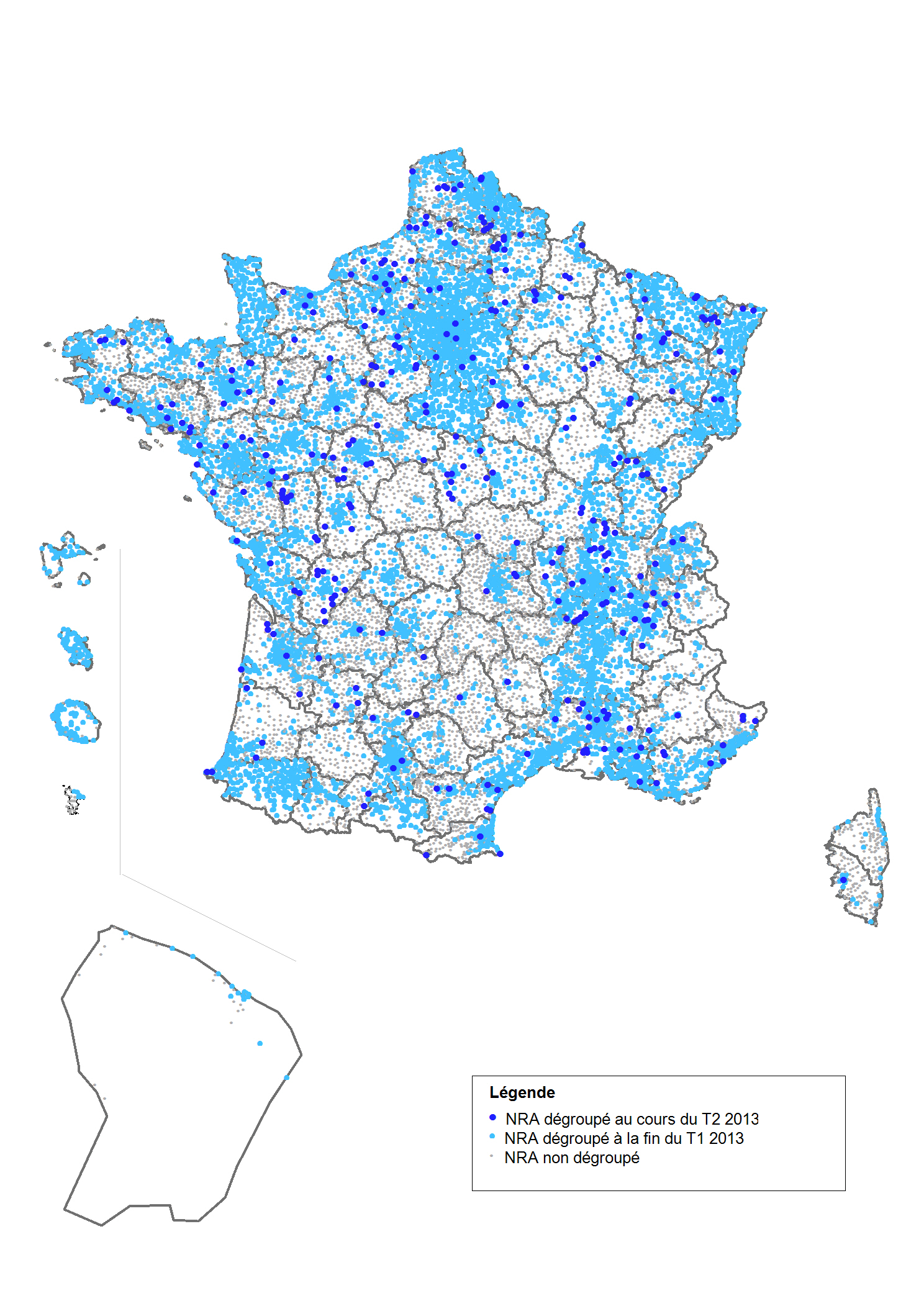 Avec plus de 7 050 NRA dégroupés (c'est-à-dire ceux où au moins un opérateur alternatif a installé ses équipements actifs au sein du NRA) - dont plus de 360 NRA-ZO - au 30 juin 2013 (soit 328 NRA dégroupés au cours du trimestre passé), 87,8 % de la population peut désormais bénéficier de la diversification et de l'enrichissement des offres résultant du dégroupage.