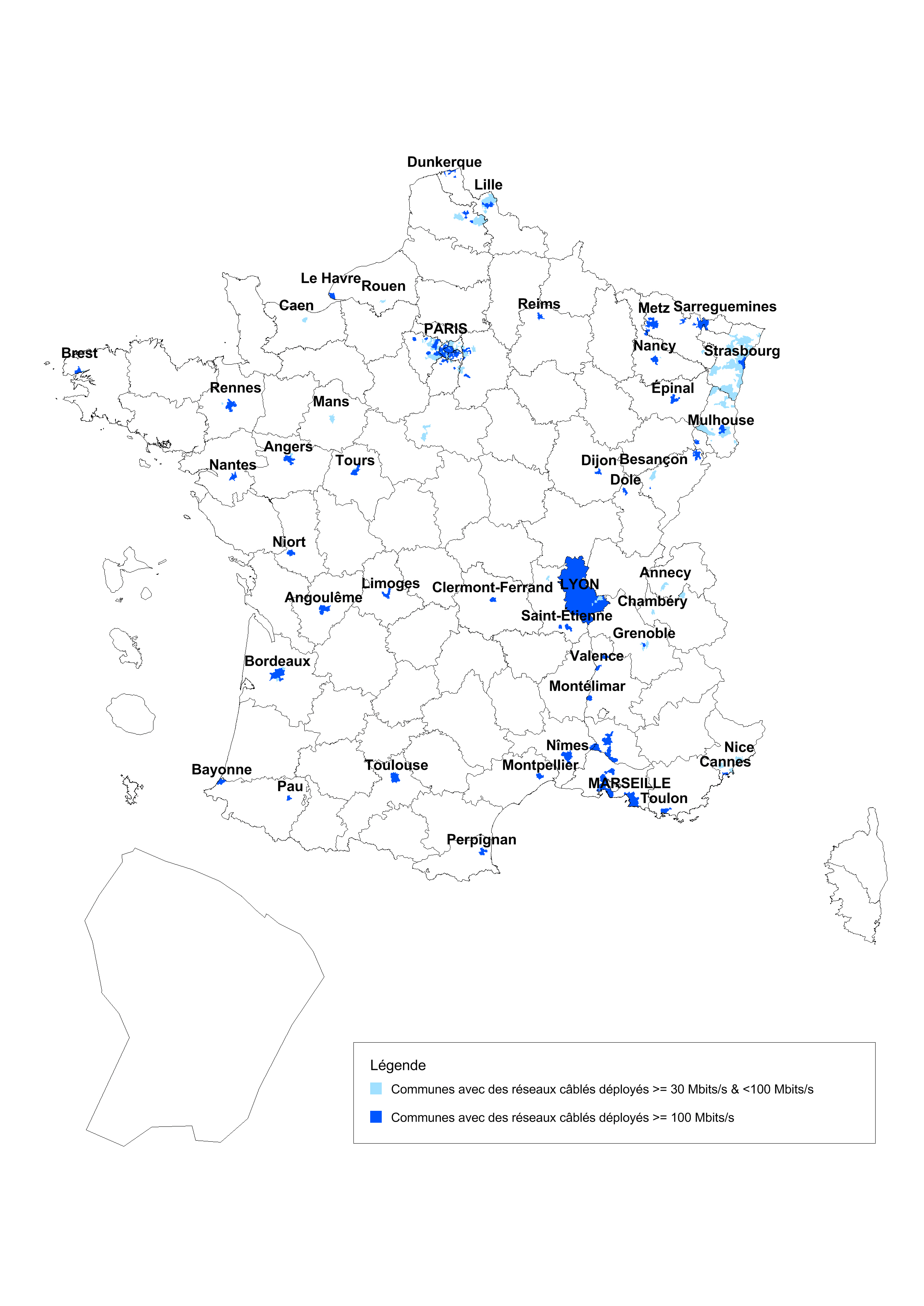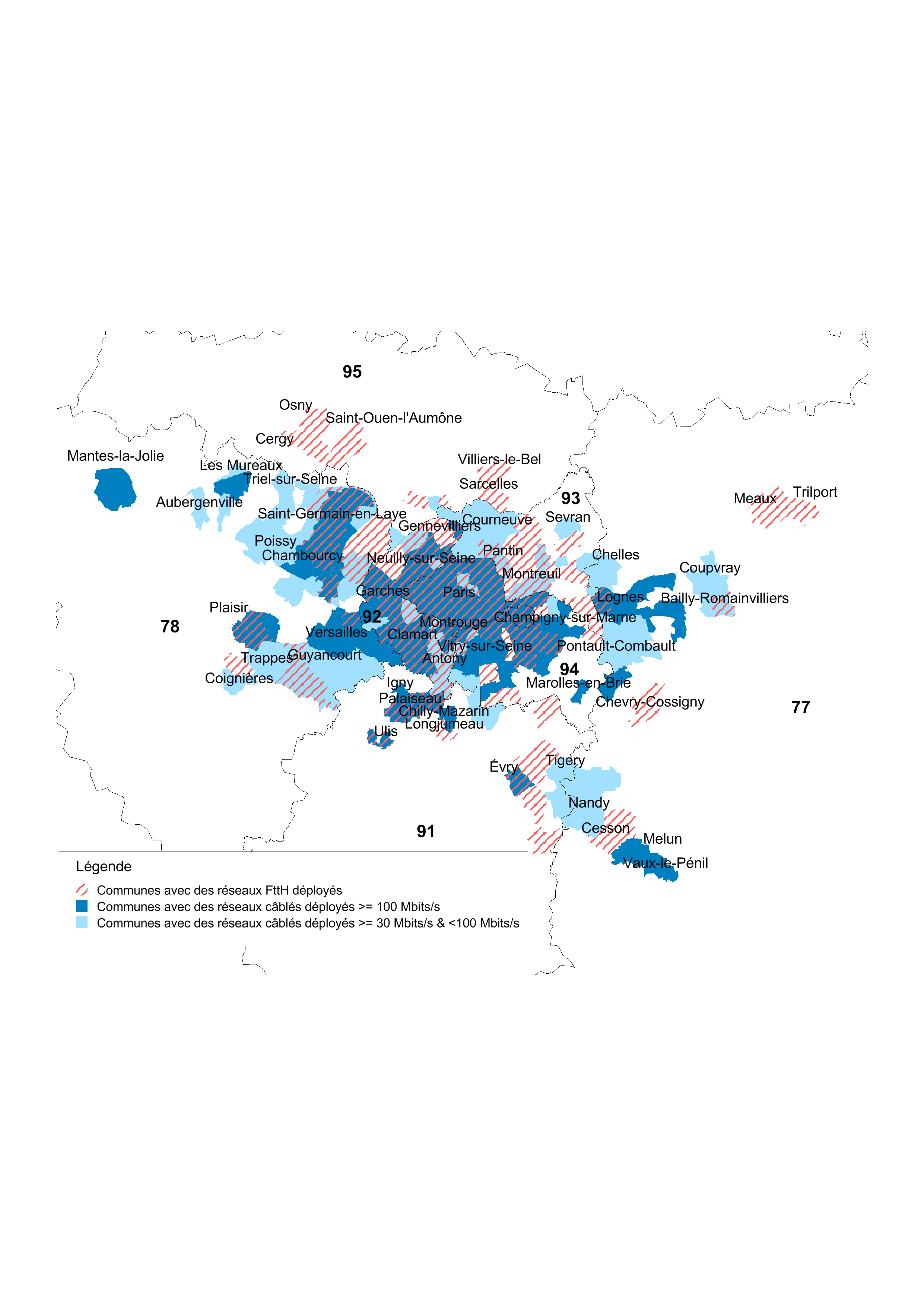 Les cartes ci-dessous illustrent l'état des déploiements de réseaux en fibre optique et en câble coaxial en cours au niveau national (1), avec des informations plus détaillées sur l'Ile de France.