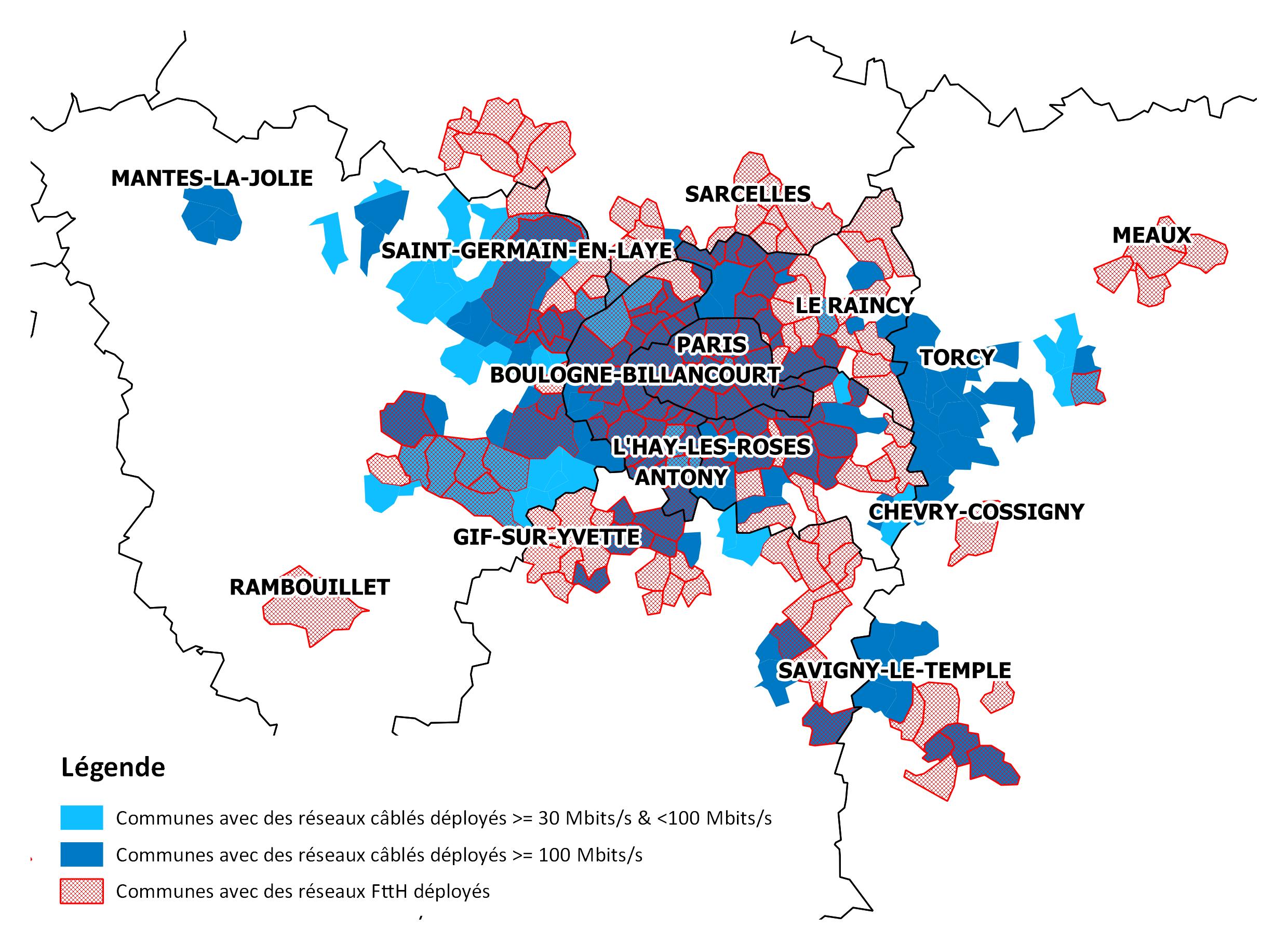 Les cartes ci-dessous illustrent l'état des déploiements de réseaux en fibre optique et en câble coaxial en cours au niveau national, avec des informations plus détaillées sur l'Ile-de-France.
