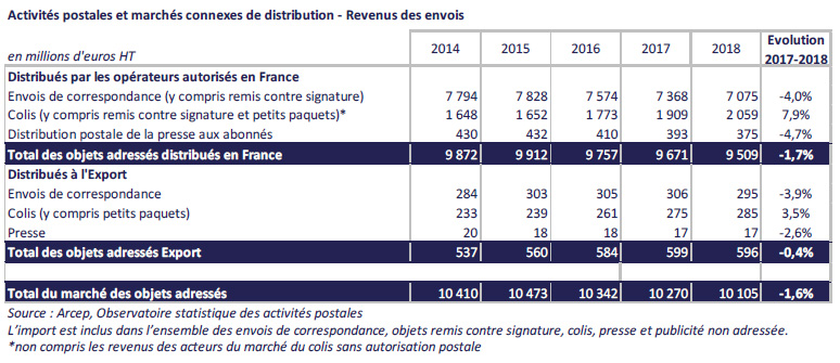Les données sur le marché des envois de correspondance sont issues de l’enquête statistique de l’Arcep auprès des opérateurs de services postaux. Cette enquête revêt un caractère obligatoire pour tous les opérateurs titulaires d’une autorisation comme le prévoient les dispositions de l'article L. 135 du code des postes et des communications électroniques : « L’Autorité de régulation des communications électroniques et des postes (Arcep) peut recueillir les données et mener toutes actions d'informations sur le secteur des postes. À cette fin, les opérateurs titulaires de l'autorisation prévue à l’article L.3 et le prestataire du service universel postal sont tenus de lui fournir les informations statistiques concernant l'utilisation, la zone de couverture et les modalités d'accès à leur service ».