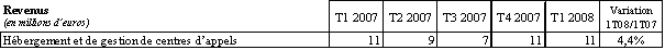 Le revenu des services à valeur ajoutée (610 millions d’euros au premier trimestre 2008) est en hausse de 1,5% par rapport au premier trimestre 2007. Le revenu des services de données progresse plus vite (+5,9% sur un an) que celui des services voix et télématique (+0,7% sur un an).