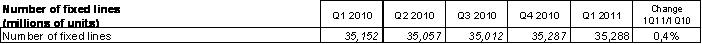 Le revenu des services fixes (téléphonie et internet sur le réseau fixe) représente 4,0 milliards d’euros au premier trimestre 2011. Il se contracte nettement ce trimestre (-4,0% sur un an) en raison du fort recul du revenu des services fixes bas débit.