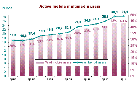 La diffusion des terminaux et les offres adaptés à l’internet mobile favorisent l’utilisation des services multimédias (internet, e-mail, etc.), mais dans une moindre mesure ce trimestre, avec seulement 90 000 utilisateurs de plus en un trimestre contre 560 000 un an auparavant. Plus d’un client sur trois (36,2% précisément) utilise au premier trimestre 2011 des services disponibles sur les réseaux mobiles 3G, soit 6 points de plus en un an.