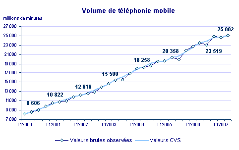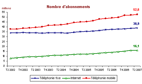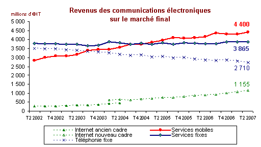 Le revenu des services mobiles, représente avec 4,4 milliards d’euros au deuxième trimestre 2007, plus de 45% de l’ensemble du revenu des services de communications électroniques. Il augmente sur un rythme annuel de l’ordre de 5% depuis le début de l’année 2006 (+6,3% au deuxième trimestre 2007).