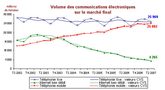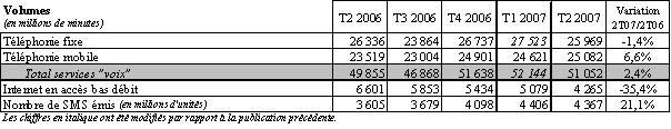 L’ensemble du volume des services «voix» (téléphonie fixe et mobile) représente 51 milliards de minutes. L’augmentation de 2,4% sur un an de ce trafic est plus faible qu’au cours de l’année 2006, essentiellement en raison de la moindre croissance du volume des communications mobiles.