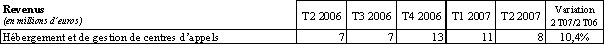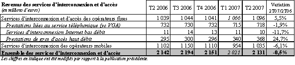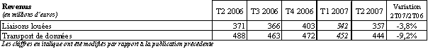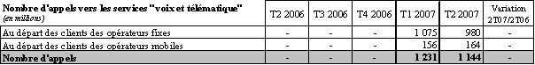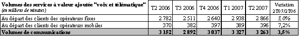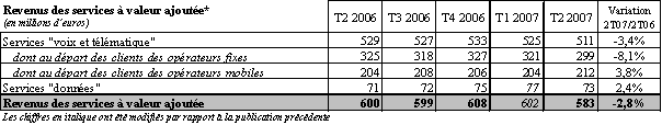 Le revenu des services à valeur ajoutée atteint 583 millions d’euros au deuxième trimestre 2007, en recul de 2,8% par rapport au deuxième trimestre 2006.Ce repli provient de la baisse du revenu des services « voix et télématique » au départ des postes fixes (en recul de 8,1% sur un an). Dans le même temps, le revenu des appels vers les services à valeur ajoutée émis depuis des mobiles progresse, que ce soit pour les services vocaux (+3,8% sur un an) ou pour les services de type « données » (+2,4% sur un an).Au deuxième trimestre 2007, 1,1 milliard d’appels ont été émis vers les services vocaux, 85% de ces appels proviennent des postes fixes (dans lesquels sont aussi comptabilisés les appels vers les services télématiques).
