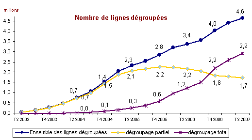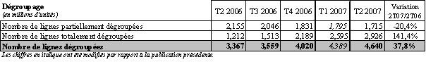 La croissance du nombre de lignes dégroupées se poursuit à un rythme toujours aussi soutenu. A la fin du deuxième trimestre 2007, 4,6 millions de lignes sont dégroupées. Désormais, près des deux tiers de ces lignes, soit 2,9 millions, sont des lignes totalement dégroupées.