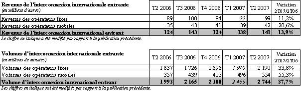 Le revenu des services d’interconnexion des opérateurs mobiles (1,0 milliard d’euros au deuxième trimestre 2007) recule de 6,1% sur un an. Cette évolution est notamment liée à la baisse du tarif de la terminaison d’appel voix (-21% pour Orange France et SFR et -18% pour Bouygues au 1er janvier 2007). En revanche, la hausse du trafic mesuré en minutes atteint 22,0% sur un an.