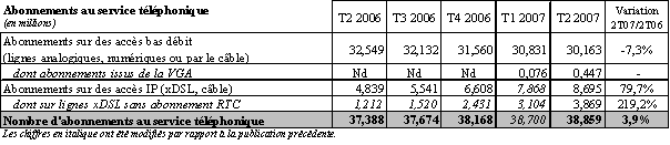 Le nombre d’abonnements à un service téléphonique atteint 38,9 millions à la fin du deuxième trimestre 2007. Plus de 20% des abonnements téléphoniques, soit 8,7 millions d’abonnements, sont désormais des abonnements à un service de voix sur large bande, ce qui correspond à un quasi doublement en un an (+3,8 millions d’abonnements supplémentaires), tandis que le nombre d’abonnements « traditionnels » sur des accès bas débit se replie légèrement pour se situer un peu au dessus de 30 millions.