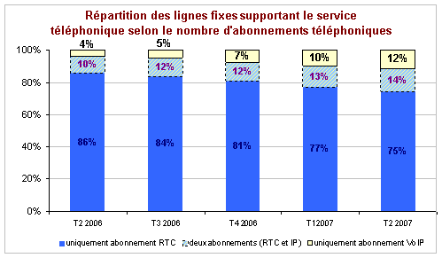 L’autre partie des abonnements à un service de voix sur large bande (issus d’offres de dégroupage partiel ou d’offres de gros de «bitstream») vient s’ajouter à un abonnement téléphonique existant que le client choisit de conserver. Ainsi, au deuxième trimestre 2007, 14% des lignes supportent deux abonnements à un service de téléphonie (un abonnement «classique» sur le RTC et un abonnement à un service de voix sur IP).