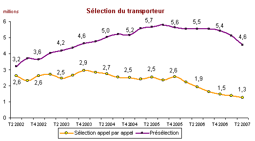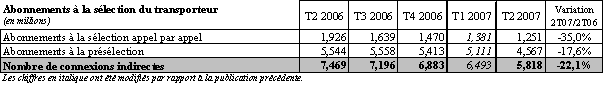Les offres de téléphonie basées sur la sélection du transporteur (sélection appel par appel ou présélection), cèdent du terrain devant les offres de téléphonie sur IP depuis le début de l’année 2006. Ces offres ont diminué de 1,7 million d’abonnements en un an et, au deuxième trimestre 2007, concernent 5,8 millions de clients. La baisse du nombre d’abonnements en présélection est plus marquée depuis le début de l’année 2007 (-17,6% sur un an au deuxième trimestre).