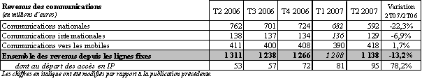 Le revenu des communications téléphoniques depuis les lignes fixes diminue de 13,2% sur un an au deuxième trimestre 2007 et ne représente plus désormais que 42% des revenus de la téléphonie fixe (y compris publiphonie et cartes) contre 46% un an auparavant.