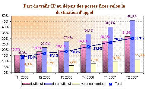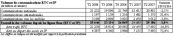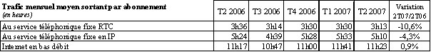 Le trafic au départ des postes fixes est pratiquement stable. Les volumes de communication au départ des accès IP continuent de fortement progresser (+75,4% sur un an au deuxième trimestre 2007) tandis que les communications émises sur le RTC poursuivent leur repli. La voix sur large bande représente 30,3% du trafic au départ des postes fixes au deuxième trimestre 2007. En moyenne, chaque client abonné à la VoIP téléphone 5h10 par mois, soit 2 heures de plus que pour la téléphonie « classique ».