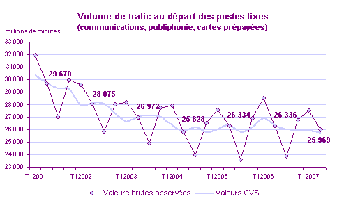 Le trafic voix au départ des réseaux fixes diminue de 1,4% sur un an au deuxième trimestre 2007, mais ce volume s’est globalement stabilisé grâce à l’apport des volumes de la téléphonie sur IP comme le montre la série corrigée des variations saisonnières.