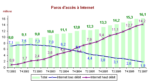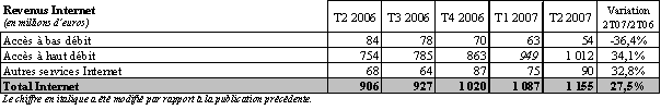 La croissance du marché Internet (nombre d’accès et revenu) est entièrement portée par l’essor des accès haut débit (sur xDSL principalement mais aussi par le câble, la BLR...). Le haut débit représente 88,3% du total des accès et 87,6% du revenu Internet au deuxième trimestre 2007. Le nombre d’accès à Internet (haut débit et bas débit) s’élève à 16,1 millions à la fin du deuxième trimestre 2007. Le nombre d’abonnements à internet haut débit progresse de 28,5% sur un an, ce qui correspond à plus de trois millions d’accès supplémentaires sur la période). Au total, 14,2 millions d’abonnements sont à haut débit à fin juin 2007. Le revenu Internet haut débit atteint un milliard d’euros au deuxième trimestre 2007, en croissance de 34,1% sur un an. En net repli depuis plus de deux ans, tant en nombre d’accès en service, qu’en minutes de connexions et qu’en terme de revenu généré, l’Internet bas débit compte désormais moins de deux millions d’abonnés.