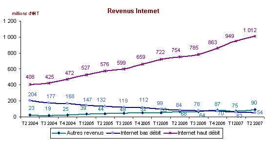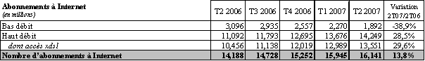 Le nombre d’abonnements à Internet atteint 16,1 millions fin juin 2007, en croissance de 13,8% sur un an. Les accès Internet à haut débit se diffusent toujours à un rythme annuel soutenu. Le nombre d’accès haut débit progresse ainsi de 3,2 millions (+28,5% sur un an) pour atteindre 14,2 millions à la fin du deuxième trimestre 2007. Le revenu du haut débit se monte à 1 milliard d’euros au deuxième trimestre 2007 (+34,1% sur un an). Le haut débit représente désormais près de 90% des abonnements et des revenus Internet.