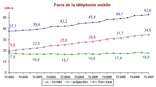 Les opérateurs mobiles réunissent 52,6 millions de clients en France à la fin du deuxième trimestre 2007. Les deux tiers de ces clients sont positionnés sur des formules forfaitaires. La croissance du nombre de clients de la téléphonie mobile demeure soutenue au deuxième trimestre 2007 avec une progression de +7,1% sur un an, soit 3,5 millions de clients supplémentaires sur cette période.