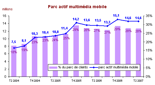 Le nombre de clients utilisant les services multimédias des opérateurs mobiles (accès à des services de type «Internet mobiles», envoi de MMS,…) est de 14,6 millions au deuxième trimestre 2007, soit 28% des clients des opérateurs mobiles. Cette proportion, qui augmentait en 2004 et 2005, s’est stabilisée depuis le quatrième trimestre 2005.