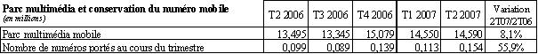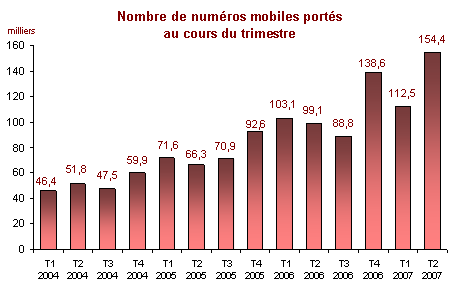 Au cours du deuxième trimestre 2007, 154 400 numéros mobiles ont été portés d’un opérateur à un autre soit une croissance de 55,9% sur un an. L’augmentation du nombre de numéros portés résulte en partie de la mise en place à partir du 21 mai 2007 de la procédure simplifiée de portabilité des numéros mobiles (dont le délai a été ramené à moins de 10 jours contre deux mois auparavant).