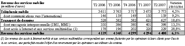 Le revenu des services mobiles (téléphonie et transport de donnée) atteint 4,4 milliards d’euros au premier trimestre 2007, en hausse de 6,3% sur un an.Cette croissance est en ligne avec les taux de croissance de 5 à 6% par trimestre relevés depuis le début de l’année 2006. Les taux annuels de croissance étaient nettement plus élevés au cours de l’année 2005 (de 8 à 10% par trimestre).Le revenu des services de transport de données sur réseau mobile (services de messagerie interpersonnelle, services d’accès à l’Internet mobile et services multimédias) représente 627 millions d’euros au deuxième trimestre 2007. La croissance du revenu de ces services (+18,6% sur un an) reste nettement supérieure à celle du revenu des communications mobiles (+4,5% sur un an). Il contribue toutefois pour moins de 15% à l’ensemble des revenus des services mobiles.