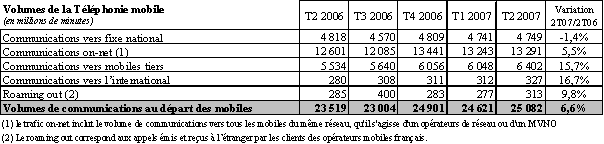 Le ralentissement du rythme de croissance du volume des communications au départ des mobiles amorcé au premier trimestre 2007 (+8,6% sur un an) se confirme au deuxième trimestre 2007 (+6,6% sur un an). La rupture de tendance avec la forte croissance relevée tout au long de l’année 2006 (environ +15%), est manifeste.