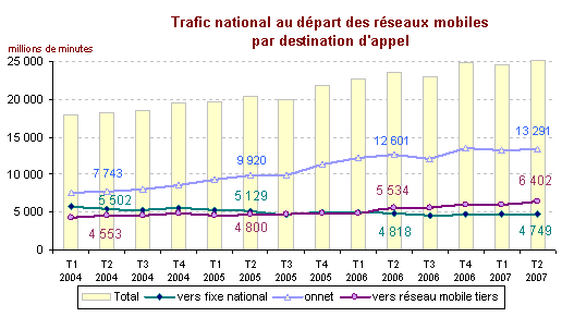 Le volume de trafic au départ des mobiles représente 25 milliards de minutes au deuxième trimestre 2007, en croissance de 6,6% sur un an. Alors que la croissance annuelle du trafic se situait à un taux soutenu de 15% durant toute l’année 2006, elle a ralenti depuis le début de l’année 2007 (avec des croissances respectives au premier et deuxième trimestre 2007 de 8,6% et 6,6% sur un an), sous l’effet de la moindre croissance du trafic on-net.La décélération du volume des communications échangées entre les mobiles d’un même réseau (communications « on-net ») est manifeste. Début 2006, le taux de croissance de ce trafic atteignait 30,8% sur un an, il n’est que de 5,5% sur un an au deuxième trimestre 2007.A l’inverse, les volumes des communications mobiles à destination des réseaux mobiles tiers et de l’international connaissent un regain de croissance sur la même période. Le volume des communications vers les téléphones fixes poursuit sa baisse amorcée au début de l’année 2005 (-1,4% sur un an au deuxième trimestre 2007).