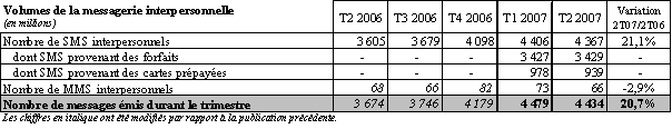 La croissance du nombre de SMS interpersonnels en revanche ne faiblit pas. Au deuxième trimestre 2007, 4,4 milliards de SMS ont été émis par les clients des opérateurs mobiles (+21,1% sur un an).