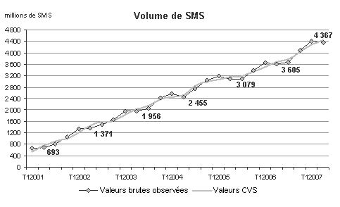 Le succès de la messagerie interpersonnelle (SMS et MMS) comme mode de communication ne se dément pas : 4,4 milliards de messages interpersonnels ont été émis au cours du deuxième trimestre 2007, soit une augmentation de 21,1% sur un an. La série désaisonnalisée portant sur le volume de SMS (qui représentent 99% des messages interpersonnels) confirme cette tendance.
