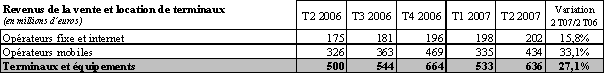 Le revenu des ventes et location de terminaux atteint 636 millions d’euros au deuxième trimestre 2007, dont plus des deux tiers pour les opérateurs mobiles.