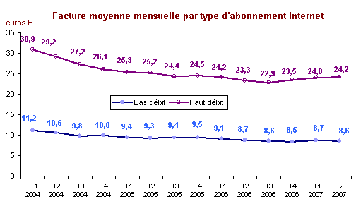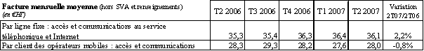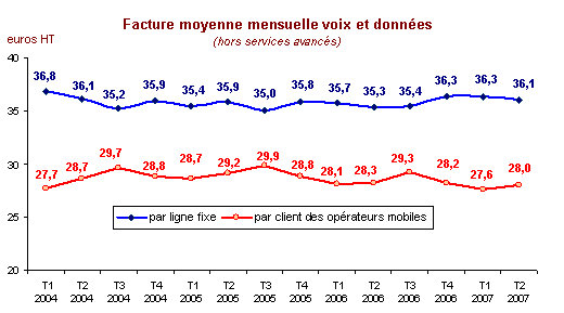 Le revenu des services mobiles atteint 4,4 milliards d’euros au deuxième trimestre 2007, en hausse de 6,3%. La facture moyenne mensuelle des clients des opérateurs mobiles (28 euros) est en léger repli de 0,8% sur un an.