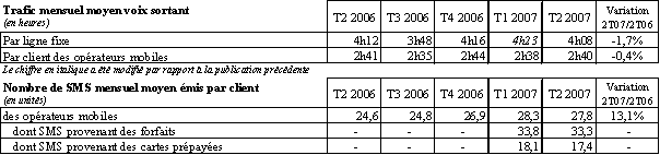 Le volume de trafic mensuel moyen par ligne fixe est calculé en divisant le volume de trafic (RTC et IP) du trimestre N par une estimation du parc moyen de lignes fixes du trimestre N rapporté au mois. Le volume de trafic mensuel moyen par client des opérateurs mobiles est calculé en divisant le volume de la téléphonie mobile (y compris roaming out) du trimestre N par une estimation du parc moyen de clients du trimestre N rapporté au mois. Le nombre de SMS moyen par client, est calculé en divisant le nombre de SMS du trimestre N par une estimation du parc moyen de clients du trimestre N rapporté au mois.
