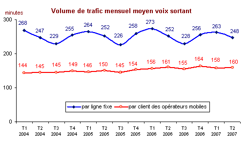 Le volume de trafic des services de téléphonie (fixe et mobile) atteint 51,1 milliards de minutes au deuxième trimestre 2007, soit une progression de 2,4% sur un an.