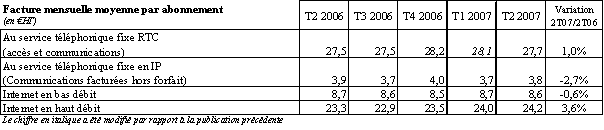 La facture mensuelle moyenne par abonnement RTC est calculée en divisant le revenu des abonnements et des communications depuis les lignes fixes sur le RTC (c’est à dire hors revenus VoIP), pour le trimestre N par une estimation du parc moyen d’abonnements du trimestre N rapporté au mois. La facture mensuelle moyenne par abonnement à un service de téléphonie sur accès IP est calculée en divisant le seul revenu des communications IP facturées (c’est à dire hors forfaits de type multiplay) sur le trimestre N par une estimation du parc moyen d’abonnements du trimestre N rapporté au mois. La facture mensuelle moyenne par abonnement à Internet bas débit (respectivement haut débit) est calculée en divisant le revenu des accès bas débit (respectivement haut débit) à Internet du trimestre N par une estimation du parc moyen de clients du trimestre N rapporté au mois.