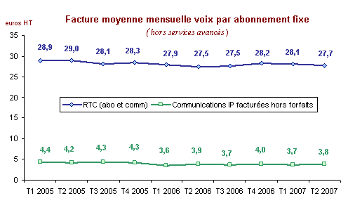 Cette évolution traduit l’évolution à la baisse des tarifs de détail sur le RTC (baisse du tarif des communications nationales et des communications vers les mobiles), mais aussi l’érosion du volume de communications émises sur le RTC (baisse de 16,8% sur un an au deuxième trimestre 2007), ainsi que le mouvement de substitution de la téléphonie classique vers la téléphonie IP (voir note ci-dessous).