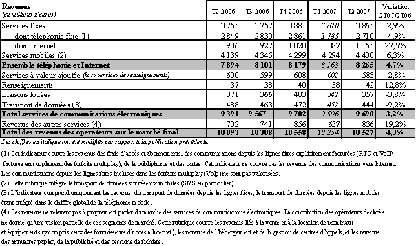 Hors services annexes (vente et location de terminaux, annuaires, publicité, hébergement et gestion de centre d’appels…), le revenu des services de communications électroniques sur le marché des clients finals est de 9,7 milliards d’euros au deuxième trimestre 2007. Il enregistre une croissance de 3,2% sur un an.