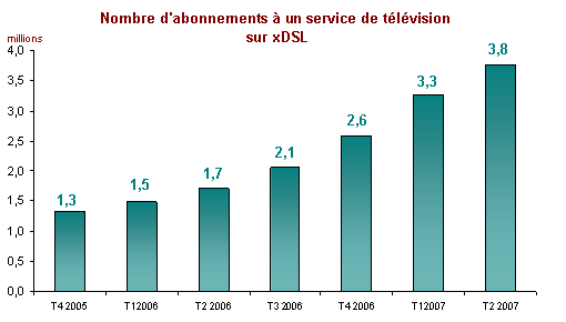 Le nombre d’abonnements à un service de télévision via la technologie xDSL atteint 3,8 millions à la fin du deuxième trimestre 2007. Plus de deux millions d’abonnements supplémentaires ont été souscrits en un an.