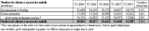 Le nombre de clients à un service de téléphonie mobile atteint 52,6 millions à la fin du deuxième trimestre 2007. La proportion de clients positionnés sur des formules forfaitaires (65,7% à la fin du deuxième trimestre) continue de s’accroître.