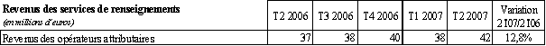 L’érosion du volume d’appel vers les services de renseignements se poursuit. Ainsi, 35 millions d’appels ont été émis au cours du deuxième trimestre 2007 contre 41 millions un an plus tôt, soit une baisse de 14,5%. Le revenu des services de renseignements s’élève à 42 millions d’euros, en progression de 12,8% sur un an.