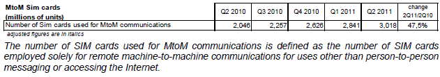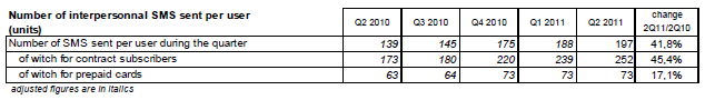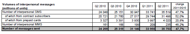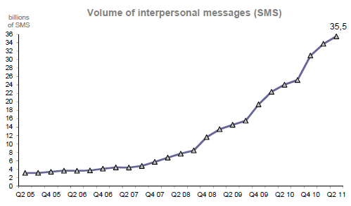 Le nombre de SMS émis au cours du deuxième trimestre 2011 est de 35,5 milliards, soit 11,5 milliards de plus qu’au deuxième trimestre 2010.