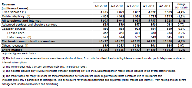 Le revenu des services de communications électroniques vendus par les opérateurs sur le marché final (hors leurs revenus annexes) s’élève à 10,1 milliards d’euros au deuxième trimestre 2011. Il diminue de 2,7% par rapport à celui du deuxième trimestre 2010.