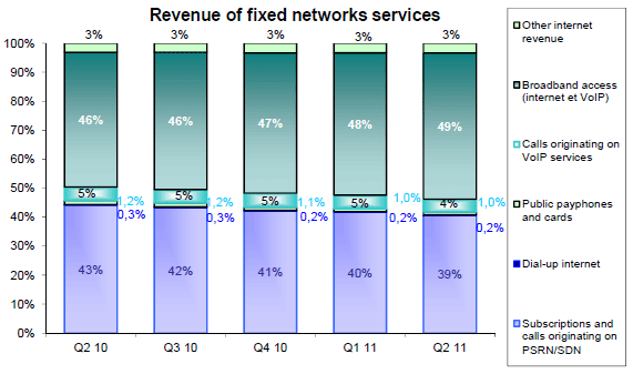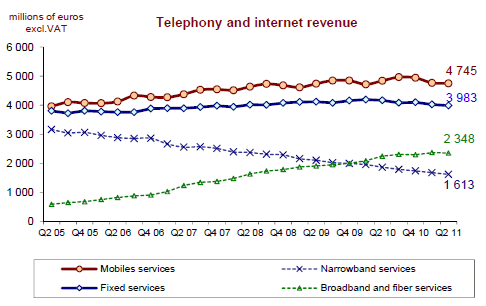 Le revenu des services fixes (téléphonie fixe et accès à internet) représente 4,0 milliards d’euros au deuxième trimestre 2011. Il se contracte nettement depuis deux trimestres (-4,4% sur un an au deuxième trimestre 2011) en raison du fort recul du revenu des services fixes à bas débit (téléphonie sur le RTC, internet à bas débit, publiphonie et cartes) en baisse de 13,4% sur un an (pour 1,6 milliard d’euros). Le marché des services à haut et très haut débit (services de téléphonie fixe sur large bande et accès à internet) est à l’inverse en croissance continue (+2,9% sur un an au deuxième trimestre 2011) et représente, avec 2,4 milliards d’euros, une part toujours croissante du revenu des services fixes (59%, +4 points en un an).