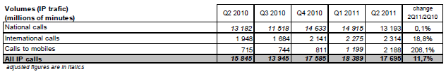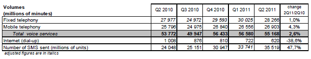 Le trafic total des services de téléphonie sur les réseaux fixes et mobiles s’élève à 55,2 milliards de minutes au deuxième trimestre 2011 et augmente de 2,6% en rythme annuel.