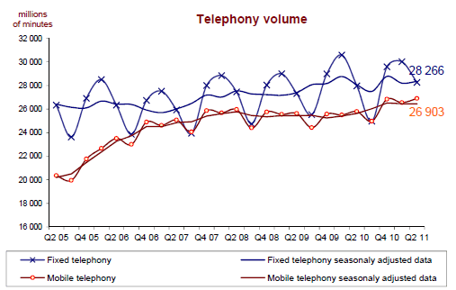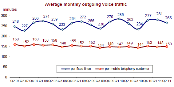 Le volume des communications téléphoniques mobiles s’élève à 26,9 milliards de minutes au deuxième trimestre 2011. Alors qu’elle stagnait depuis le quatrième trimestre 2008, la consommation de minutes progresse pour le cinquième trimestre consécutif avec une envolée au quatrième trimestre 2010 (+4,9% en un an) ; la croissance annuelle est de +4,2% au premier semestre 2011. Le trafic vers les téléphones fixes baisse continûment depuis cinq années, mais dans une moindre mesure depuis le premier trimestre 2010 (-0,4% en un an ce trimestre).